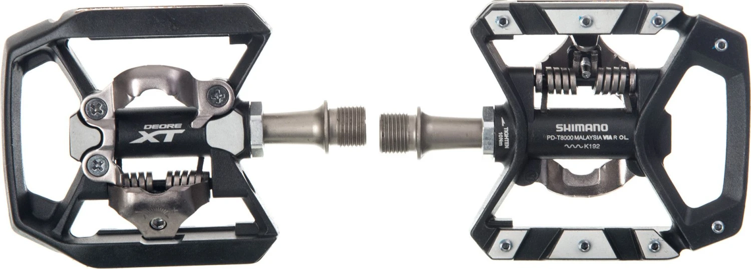 The new semi-automatic Shimano Deore XT T8000 pedals use SPD technology, the performance of which is yet to be proven. The support surface is increased and allows the foot to position well, they have two faces, one in SPD and the other flat with spikes allowing to leave well in bad conditions without trying to clip. These evolutions allow to gain in power, stability and comfort.
