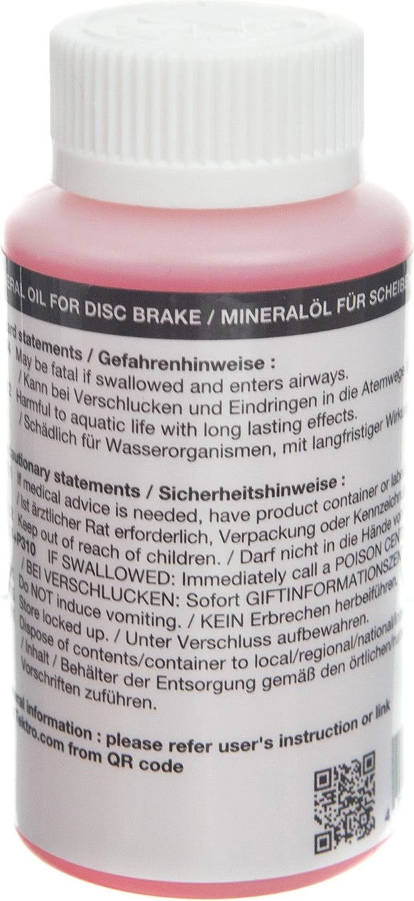 Tektro Mineral Oil is a high performance brake fluid that will keep your brakes working on any terrain; to be used exclusively in hydraulic brake systems with mineral oil. Under no circumstances should it be used in hydraulic brake systems based on DOT oil.